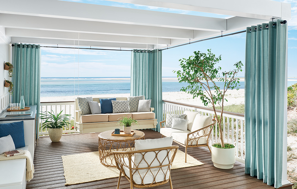 Outdoor patio shades are available in different high-quality materials and styles. Some exterior shades, like solar shades, keep your view clear and protect your space from UV rays. Other window treatments, like natural woven shades, add a textured, natural look to your outdoor living areas.